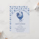 Um design chá de fraldas azul-e-branco eterno para para amantes do estilo country francês. O galo desenhado pela mão com borboletas e cabeçalho de madeira cria uma vibração de uma fazenda de chic que é perfeita para uma celebração neutra, de menino ou de menina. Edite facilmente o nome, a data, a hora, o endereço, o RSVP e o registro da honestidade em minutos. Trabalha para chás temáticos de café, chá ou jardim de galhardetes/casas de fazenda