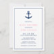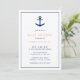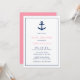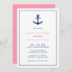 Náutica chamada de chuveiro de bebês com um design simples e moderno com uma âncora azul marinho junto com seus detalhes de evento dentro de uma fronteira, sobre um fundo branco. O título "Chá de fraldas", o seu nome e o fundo estão cor-de-rosa. Estes convites elegantes são perfeitos para uma celebração temática costeira de verão na praia.