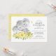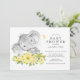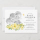 Elefante alegre e adorável com flores amarelas bonito, chá de fraldas convite para um chá de fraldas neutro em termos de gênero.