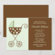 Simples convite para chás de fraldas ou novo anúncio de nascimento ou adoção de bebê apresenta uma bela ilustração vetorial de uma carruagem de bebê ou carrinho em tons de verde e marrom. Cores personalizadas disponíveis por solicitação.