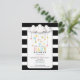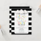 Um convite de chá de fraldas moderno com ilustração de nuvens com coração sobre fundo listrado preto e branco.