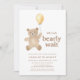Este charmoso convite de chá de fraldas neutro em termos de gênero é decorado com um ursinho de pelúcia e um balão amarelo. Diz "Podemos esperar" em uma simples tipografia e é facilmente personalizável. Original Watercolor © Michele Davies.