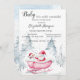 O convite para chás de fraldas bonitos mostra a floresta de inverno com o Papai Noel, e o boneco de neve com trenó rosa. Esses convites para chuveiros de bebês são facilmente personalizados para seu evento simplesmente adicionando seus detalhes.