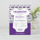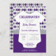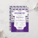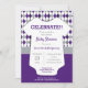 Um padrão elegante e sobredimensionado em cores escolares de roxo e cinza define o pano de fundo para este design chá de fraldas giro. Uma roupa branca para bebês tem todo o texto escrito nela para o grande evento, que pode ser um chá casal ou apenas para a mãe. O design vem em marrom e cinza, laranja e cinza queimadas, vermelho e preto, verde e preto, laranja e marinho, verde e amarelo, roxo e cinza. Produtos correspondentes disponíveis.