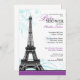 Os convites parisienses elegantes e modernos do chá de fraldas com uma torre Eiffel da cinza-escala sobre uma beira inferior roxa com azul do aqua florescem atrás dele.