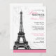Convites cor-de-rosa: Convites parisienses elegantes e modernos do chá de fraldas com uma torre Eiffel da cinza-escala sobre uma beira inferior cor-de-rosa com luz - a cinza floresce atrás dela.