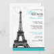 Convites à Turquesa: O elegante e moderno Baby Shower parisiense convoca com uma Torre Eiffel em escala de cinza sobre uma borda de baixo de turquesa com cinzas de luz voando atrás dela.