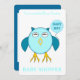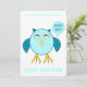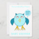 Este maravilhoso convite para Chás de fraldas apresenta um desenho fofo de uma coruja azul com olhos sonolentos, um bico aberto e penas fofinhas. A coruja está segurando um balão azul em pó. Há texto azul pálido dentro no balão que diz, "Bebê rapaz". Este é o presente perfeito para celebrar um bebê recém-nascido. Há texto personalizável no verso para que você possa personalizar este convite.