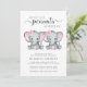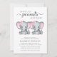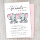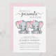 Uma linda menina gêmea chá de fraldas por e-mail convidando com "Dois amendoins doces estão a caminho" escrito em tipografia de cinza mole e um roteiro de na moda, e aquarelas cor-de-rosa pastel de elefantes bebês. Personalize o nome e o chá da futura mãe por email em uma simples tipografia de cinza.