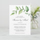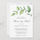 Chá de fraldas Russo por Correio para quando não se pode encontrar pessoalmente. Este convite apresenta um simples design com uma aquarela pintada de cinza verde com folhas grandes, sobre fundo branco. Abaixo estão os detalhes de seu evento em uma cinza macia e a parte traseira tem uma lavagem com aquarela verde-clara. Esta elegante design botânica é neutra em termos de gênero e funciona para um rapaz ou uma rapariga.