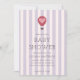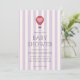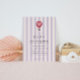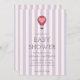 Convite de chá de fraldas bonito com um fundo listrado púrpura pastel emparelhado com um balão de ar quente desenhado à mão e uma fonte serif elegante na qual sua informação personalizada está escrita. Você pode encontrar mais produtos correspondentes desta coleção em nossa loja.