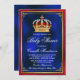 Chá de fraldas real com bonito coroa vermelha e dourada sobre um belo fundo azul real, vermelho e ouro. Você pode alterar o texto conforme necessário para o seu evento. Impressão em papel brilhante para obter melhores resultados.