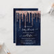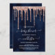 Este convite bonito e giro para chás de fraldas é perfeito para o evento de tendências e na moda. Ele apresenta pingos de brilho rosa dourado cintilantes impressos em falso sobre um fundo azul marinho escuro. É moderno, glamouroso, chique, único e legal; o design perfeito para o seu dia especial. ***NOTA DE DESIGN IMPORTANTE: Para qualquer solicitação de design personalizada, como solicitações de correspondência de produtos, alterações de cor, mudanças de posicionamento ou qualquer outra solicitação de alteração, clique no botão "CONTACT" ou envie um e-mail ao designer diretamente em lafemme.art@gmail.com. Você pode até enviar um e-mail para ela solicitando um design completamente personalizado e novo.