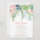 Flores cor-de-água cor rosa e verde para um convite para chá de fraldas feminino. Tem um fundo de coordenação e faz o chá de fraldas perfeito para a mãe ser.