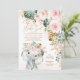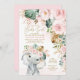 Um doce amendoim está a caminho! Celebre a chegada iminente da sua pequena selvagem com este belo convite de chá de fraldas com ilustração adorável de um doce elefante bebê, verde tropical exuberante e belíssimas flores de pincel e rosa.
