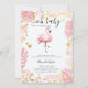Uma doce ilustração aquosa de um flamingo cor-de-rosa, com uma tiara na cabeça e rodeada por folhas tropicais exuberantes em cor-de-rosa arranjadas em uma armação, com estrelas douradas ao redor (isto é um efeito digital, não uma folha de alumínio real) é a peça central desse adorável convite para chá de fraldas de menina, perfeito para os meses de verão para uma mãe ser que ama o tema do chá de fraldas flamingo. Moderno e moderno, é elegante, mas perfeitamente adequado para uma celebração relaxada.