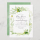 Convite de chá de fraldas verde que inclui samambaias, flores silvestres e morangos e um fundo de lavagem de cor verde-aquosa.