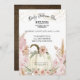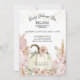 "Chá de fraldas Rustic Pumpkin Pampas Grass Pink Girl Invitation." Divertido, abóbora branca para um tema de chá de fraldas ou chá de fraldas. Orquídea rosa penteada macia e flores rosa com erva-pampas e folhas de palma secas e um caule de abóbora castanho-curvado. O reverso tem o fundo negro de madeira recuperada. Copyright, artista e designer licenciado internacionalmente, Audrey Jeanne Roberts.
