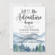 Que a aventura comece o convite para chás de fraldas de aquarelas com florestas e montanhas paisagem selvagem com tipografia de escrita de caligrafia com coração no meio. Consulte o conjunto de cheios deste design, com materiais e suprimentos de festas correspondentes em: https://www.zazzle.com/collections/forest_adventure_baby_shower-119311648144421112