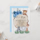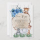Uma fatia de madeira rústica com um spray floral azul no convite para chás de fraldas gêmeos. Há animais da selva sentados na grama no fundo da fatia de madeira. Perfeito para aqueles bebês gêmeos a caminho. Personalize facilmente com as informações da sua festa.