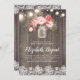 O hálito do bebê e flores cor-de-rosa, jarro de pedras, luzes de cordas, madeira, convites para chuveiros de bebês rústicos de rendas
