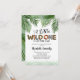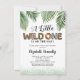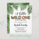 Convites de chuveiro de um bebê selvagem apresentando um simples fundo branco, brilho verde, folhas de palma da selva tropical, o ditado "um pouco selvagem está a caminho" em diferentes estampas animais, e um modelo de festa que é fácil de personalizar.