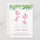 Simples e fofo convite para chá de fraldas gêmeo flamingo tropical perfeito para o verão. Os filhotes estão sob uma cobertura das folhas tropicais de verde. Ilustrada e projetada por Patricia Alvarez.