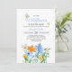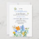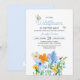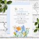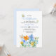 Doce e verão "pequena flor selvagem está a caminho" tema convites para duches de bebês. Apresentando lindas flores azuis, brancas, laranja e amarelas.