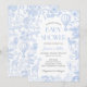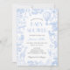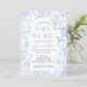 Elegante Blue Toile de Jouy Floral Chá de fraldas Convite, com um charmoso tema animal safari. Este convite maravilhosamente desenhado mostra um balão de ar quente junto com adoráveis animais safari como uma girafa, elefante, zebra e leão, todos colocados contra um fundo floral de chinoiserie azul. Com sua estética vintage e sua tipografia graciosa, este convite dá o tom para uma celebração de eterno. Totalmente personalizável para combinar os detalhes do seu evento, é a escolha perfeita para o chá de fraldas com o tema safari de um garoto, combinando encanto e sofisticação.