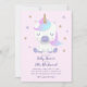Convite de chá de fraldas mágico e adorável, com um unicórnio de desenho animado, com cabelo cor rosa e menta cor verde e chifre dourada. Há estrelas roxas e douradas brilhando ao redor do unicórnio. A parte traseira da placa é uma faixa de ouro brilhante. Obtenha este convite exclusivo, mas de tendência, para o seu chá de fraldas de tema unicórnio! Os textos são facilmente editáveis online.