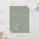 Este chá de fraldas moderno apresenta um texto branco sobre um fundo verde sábio. Um design floral de arte de linha aparece no canto inferior esquerdo. Adicione o nome da futura mãe no script de escrita manual branco de na moda e os detalhes na fonte sans serif.