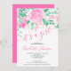 Um moderno, original e chic É um convite para chá de fraldas de menina com uma tipografia moderna, pintada à mão com flores rosas rosa brilhantes primavera de verão, folha verde e ramos com confete de brilho dourado.