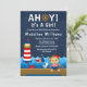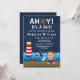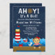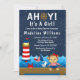 Este belo e divertido convite apresenta um macaco-marinheiro náutico num convés de madeira com uma gaivota e um caranguejo. Ao fundo há um farol vermelho e branco, um pássaro giro em um veleiro, ondas oceânicas e um céu azul marinho estrelado à noite. O texto combina fontes em negrito e sem serifa para uma aparência na moda e moderna. Isto é perfeito para um chá de fraldas temático náutico.
