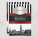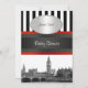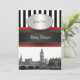 Skyline BW Black & White Stripe Invitation Red Ribbon Collection - Convite para Chás de fraldas Convites personalizáveis e acessórios com uma vista icônica do horizonte de Londres, com uma foto de aparência gravada a preto e branco do Big Ben. Eles também apresentam um padrão de fundo listrado preto e branco e uma fita vermelha e preta, bem como uma etiqueta de gradiente branco com a escolha de uma moldura de cor prateada ou dourada. Remova o quadro que você não quer. Este produto faz parte de um conjunto de designs correspondentes que são facilmente personalizáveis para muitas ocasiões e eventos. Se você precisar de placas RSVP separadas, Notas de agradecimento, Carimbos, ímanes ou outros acessórios, por favor verifique nossas outras listas. Se você não vir um produto correspondente ao qual você está interessado, ou gostaria de ver esse design em cores diferentes, com elementos de outros designs, ou com fotos diferentes do NYCisMyMuse que você vê em nossa loja, entre em contato conosco e ficaremos felizes em personalizar um design para você! Observe que este é um design gráfico e não contém tecidos, metais, gemas ou relevo. 2013 ©NYCisMyMuse