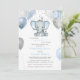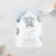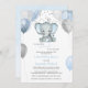 Este adorável convite para chás de fraldas apresenta elefante para bebês azuis e cinzas com balões e confete. A parte traseira apresenta aquarela azul macia. Facilmente personalizado para seu evento clicando em personalizar.