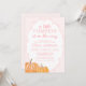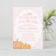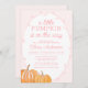Um modelo de chá de fraldas de convite para uma menina de abóbora. Este design de convite para chá de fraldas de outono apresenta abóboras laranja com arcos cor-de-rosa, uma moldura de folha de rabisco e fontes bonitas em pinks pastel.