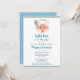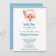 Este design de convite para chás de fraldas, bonito e tribal, apresenta uma raposa de madeira bonitinha na frente vestindo uma coroa azul Aztec, padronizada, enfeitada com penas coloridas pastel. O texto "A Little Wild One is on way" aparece acima e abaixo da raposa em azul na tipografia popular com um olhar legal, escrito à mão. Abaixo da raposa estão todos os detalhes personalizáveis do evento, também em azul, que você pode personalizar para seu próprio evento, separados por pequenas setas. A frente também inclui uma borda tribal correspondente no topo e na base. A parte traseira da placa apresenta pequenos pontos brancos em um plano de fundo azul correspondente.