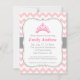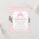 Um convite de chá de menina elegante, chique e elegante. Ele vem com um padrão de chevron rosa e branco e uma princesa tiara. Faixa Cinza com centro branco com efeitos de pontos para indicar os detalhes da parte. Este simples convite com a paleta rosa, branca e cinza é ideal para qualquer um que esteja planejando um chá de fraldas ou precise de um anúncio para a chegada de uma menina recém-nascida. O cartão de convite pode ser facilmente personalizado com os detalhes da sua festa.