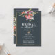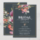 Lindo buquê floral tradicional em rosa com detalhes em dourado sobre um convite de Chá de Noiva azul escuro!