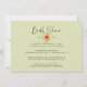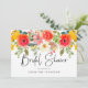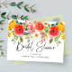 Flores de aquarela vermelhas, amarelas e verdes brilhantes ao longo da parte superior com convite de chá de noiva com letra cursiva e fonte moderna. A parte traseira é verde sólido com as informações do chá.