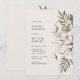 Convite de Chá de Noiva Floral Boho. Chic e moderno, este convite de chá de noiva elegante apresenta belas flores tropicais creme e marfim pintadas à mão em aquarela com folhas de palmeira verde-sage arranjadas como um buquê trendy. O fundo é bege e o texto é preto. O verso do convite inclui a mesma arte. Encontre itens correspondentes na Coleção de Casamento Tropical Boho.