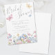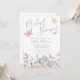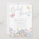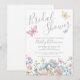 Convite de Churrasco de Noiva Borboleta de Aquarela com Flores Silvestres. Um encantador jardim de flores silvestres em aquarela define a cena para o tema de festa "O Amor Está em Flor" com borboleta floral. Este design simples, mas caprichoso, apresenta tons suaves de rosa, azul, amarelo e verde, com sutil ênfase em borboleta e acentos florais complementados por leves toques de cinza.