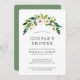 Convite elegante de chá de casamento de casal com guirlanda pintada à mão com rosas brancas e folhagens no topo. O verso é um verde sólido e pode ser alterado para qualquer cor desejada. Esses convites são perfeitos para um chá de casal no verão.
