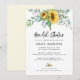 Convite de chá de noiva elegante e rústico com girassol aquarela e verde de eucalipto com caligrafia e fonte moderna.
