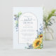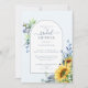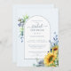 Elegante Chá de panela Amarelo Azul Sunflower Modern Watercolor Este convite contém girassóis, flores silvestres e caligrafia personalizada. A cor azul macia é o pano de fundo perfeito para este convite à aquarela.