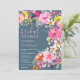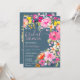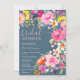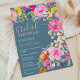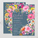 Chá de panela floral branco boêmico com aquarela pintada à mão, flores brilhantes cor-de-rosa, laranja, amarelas, folhas verdes de eucalipto e folhagem indigo com uma moderna letra de pincel em azul empoeirado. Convidado perfeito para Primavera e verão, para o tema da festa de jardim e ao ar livre.