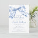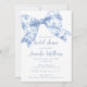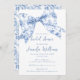 Celebre em estilo com nosso elegante e charmoso chá de panela temático "Algo Azul". Apresentando um delicado arco azul em um estilo chic Coquette e um padrão floral de eterno no verso, este design adiciona um toque de sofisticação de vintage ao seu dia especial. Perfeito para um chá de panela clássico, romântico e pré-pago.