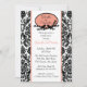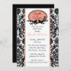 Comece seu evento bem com nosso Chá de panela apresentando uma linda estrutura oval com pássaros em galhos com Damasco branco e preto com trim de coral. Combinação de cores preto e branco de tendência. Apenas personalize nosso convite com suas informações de casamento e você está pronto para ir