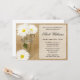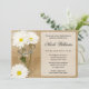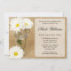 Um chá de panela temático do país rústico. Caracterizar uma fotografia bonita de um frasco de pedreiro de vidro encheu-se com as margaridas brancas em um fundo de serapilheira. Vintage e romântico. Personalize facilmente com seus detalhes do evento.