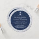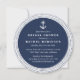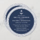 Cartões de convite redondos únicos no estilo náutico clássico apresentam uma borda de corda trançada branca e uma ilustração de âncora de um navio num fundo azul rico de marinho. Adicione as informações do registro à parte traseira usando o campo fornecido.